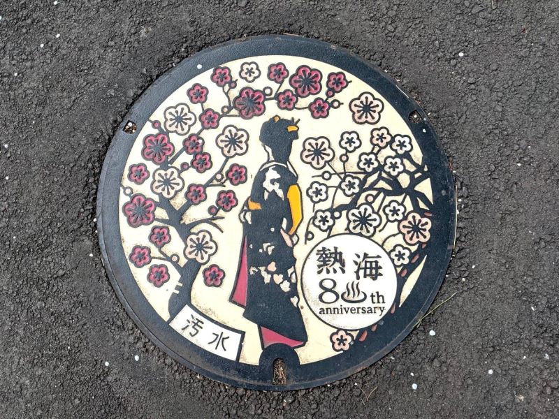 こちらは今まさに梅まつりが開催中の熱海梅園バージョンのマンホール。梅園内で見られます。立っているのは芸妓見番の芸妓さんでしょうね。
