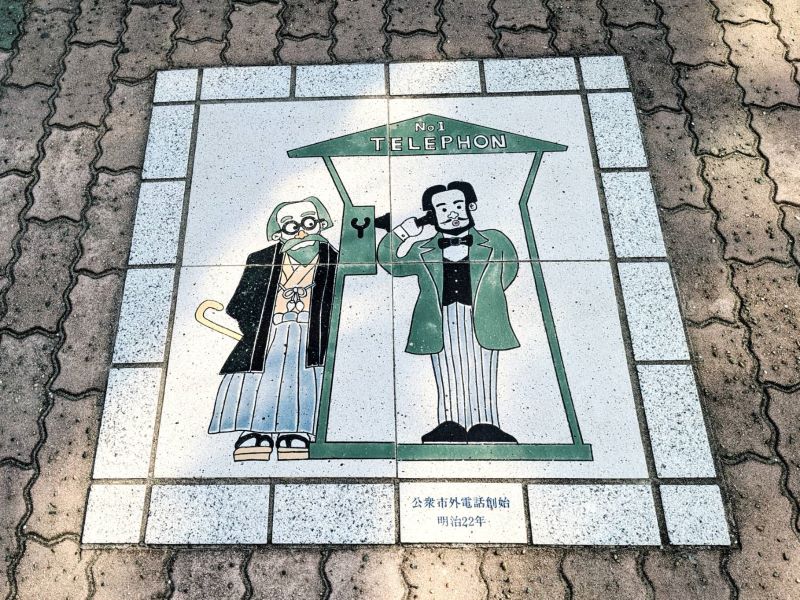サンビーチ沿いには熱海の歴史シリーズのタイルが並んでいます。熱海は日本で初めて公衆電話ができた場所。明治22年!!
