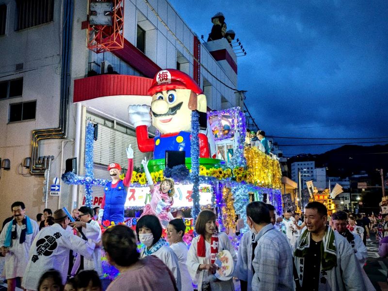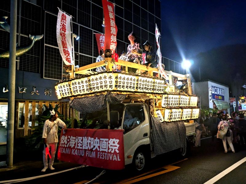 水口町の山車は、10月に行われる熱海怪獣映画祭をアピール。