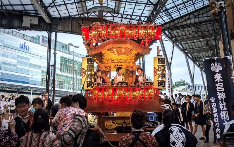 優勝した田原本町の山車「木彫りの七福神」。ホーム(駅前の商店街)で出発前から観光客の注目を集めていました。